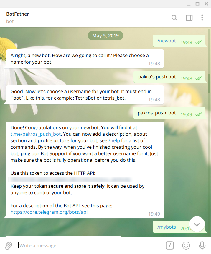 - 这时候会让你输入你的bot名字,类似我们展示出来的名字,比如我输入了pakro’s push bot
