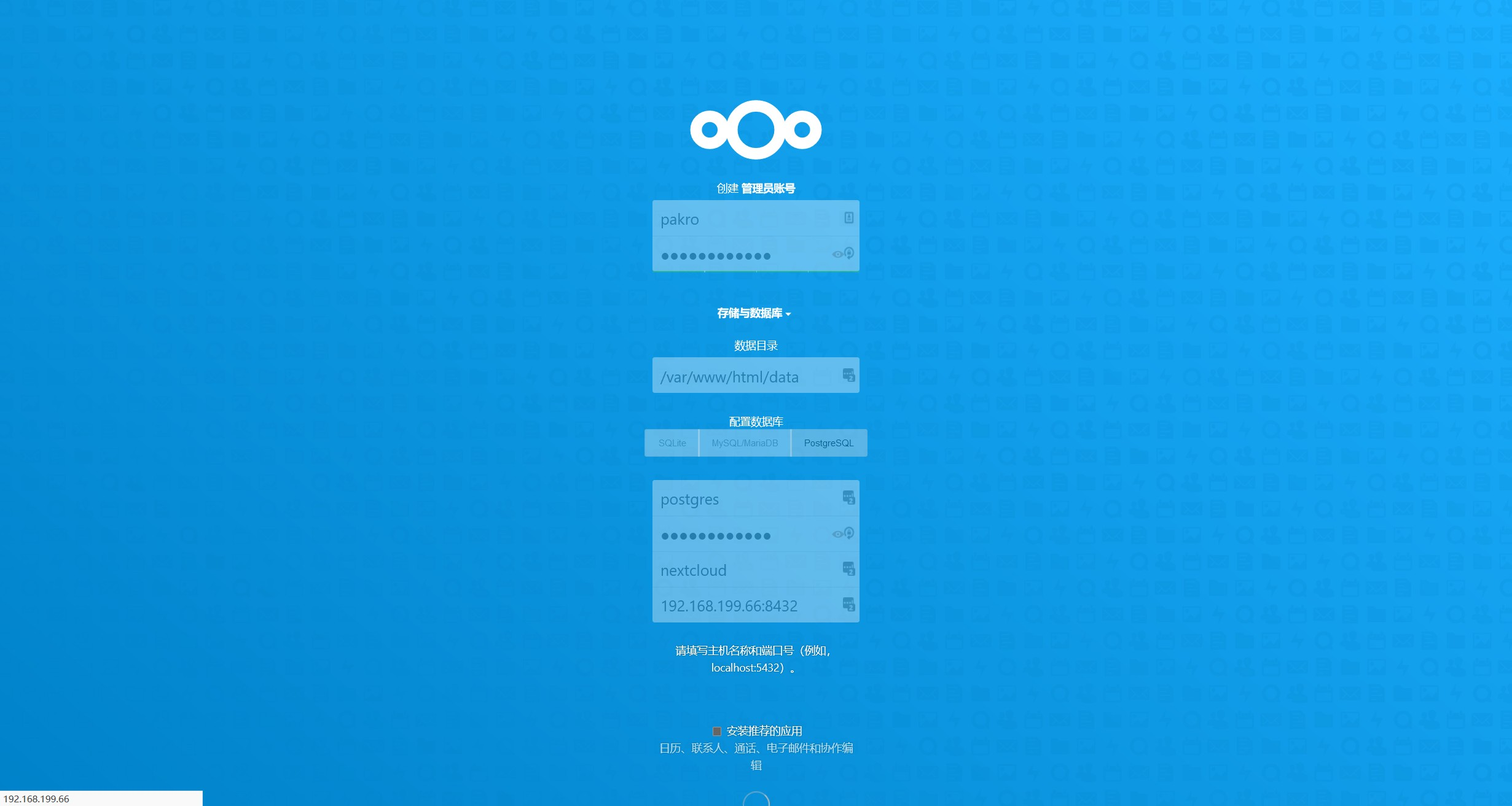 填入账号密码后,数据目录保持不变,下方数据库账号填入postgres,密码是刚才自己设置的那个,表名称可以随便填,我写的nextcloud,数据库地址写docker宿主机的ip+刚刚设置的端口号,然后点击确定等待nextcloud初始化一会就可以使用了。